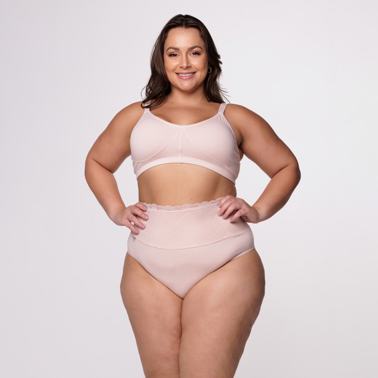 Calcinha de Cintura Alta Plus Size em Algodão Egípcio com Barra de Renda Forrada na Cor Nude