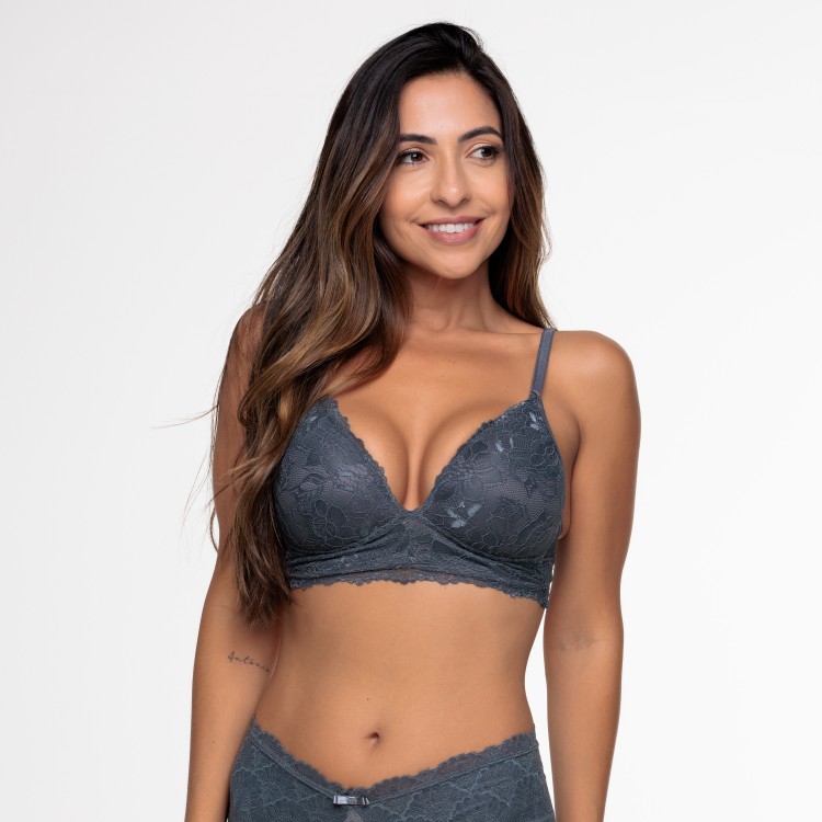 Sutiã com Bojo Flexível Sem Aro em Algodão Egípcio e Renda Cinza Mescla Escura