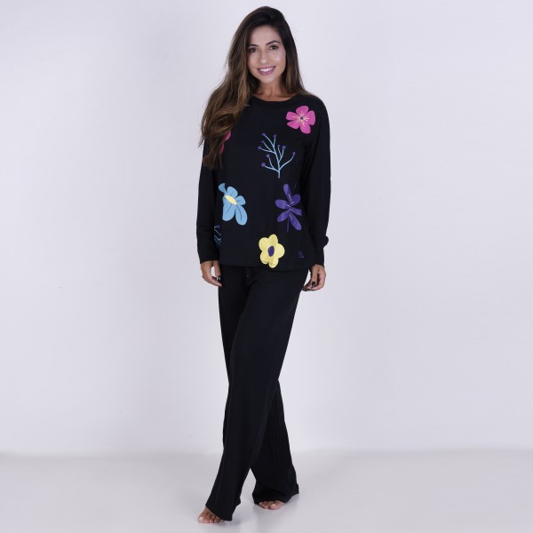 Pijama Longo em Algodão e Poliéster . Composto por duas peças, o modelo é ideal para boas noites de sono. A blusa apresenta decote em "U", mangas longas e detalhe de estampa em silk . Já a calça, em modelagem básica, possui elástico e fita para amarrar.