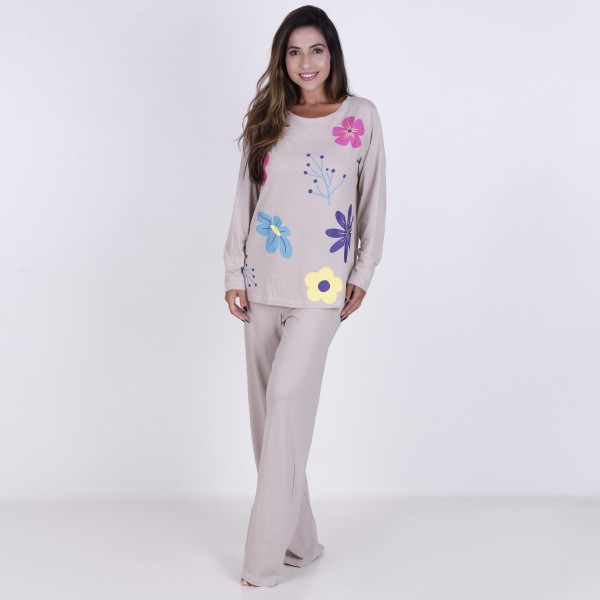 Pijama Longo em Algodão e Poliéster . Composto por duas peças, o modelo é ideal para boas noites de sono. A blusa apresenta decote em "U", mangas longas e detalhe de estampa em silk . Já a calça, em modelagem básica, possui elástico e fita para amarrar.