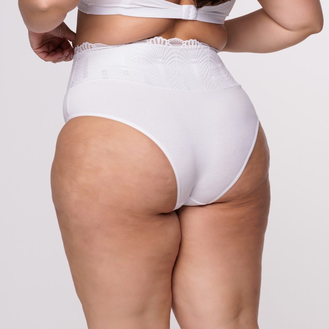 Calcinha de Cintura Alta Plus Size em Algodão Egípcio na cor Areia com Barra de Renda Forrada na Cor Branca