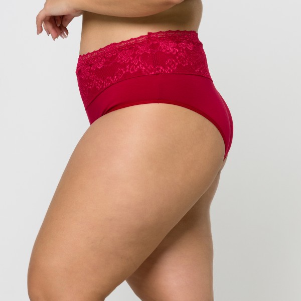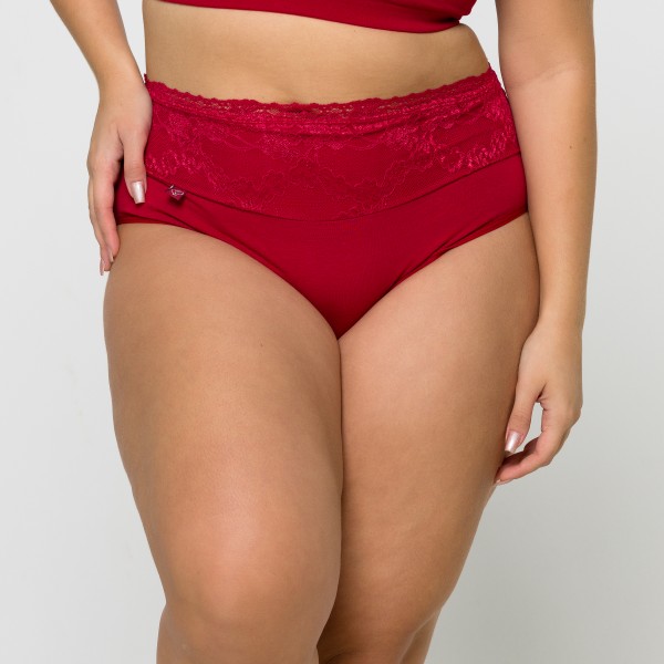 Calcinha de Cintura Alta Plus Size em Algodão Egípcio na cor Rubi com Barra de Renda Forrada